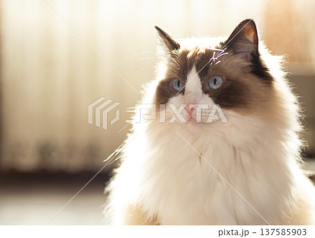adorable ragdoll cat with long fur and blue eyes
