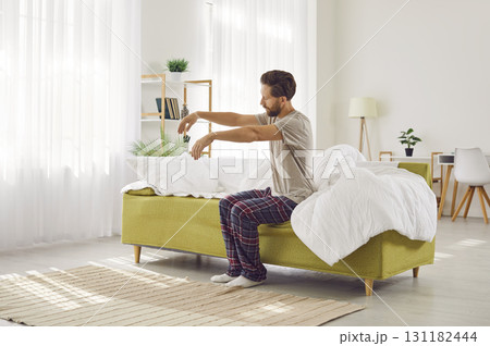 Sleepy man reaching to stop ringing alarm clock on side table in morning at home