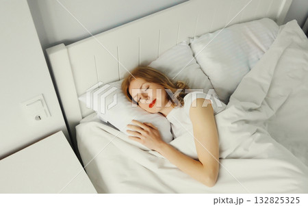 Woman sleeping lying in bed on white soft comfortable pillow in bedroom at home