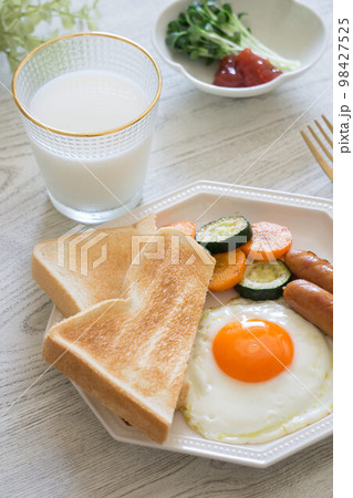 朝食イメージ ( 食パン サラダ 目玉焼き ウインナー ベーコン )