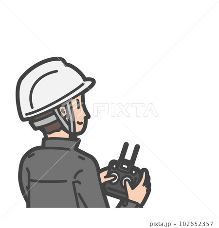 ヘルメットを着用し、プロポでドローン・ラジコンを運用する作業員・パイロット
