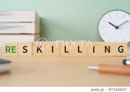 RESKILLINGと書かれたブロックが置かれたデスク