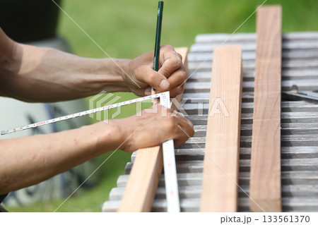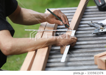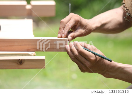 材木に印をつける男性