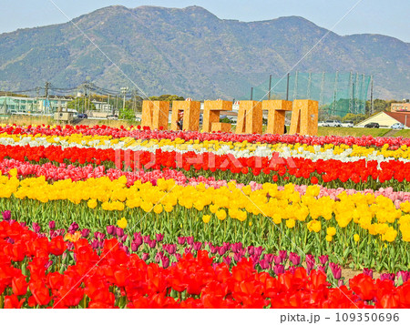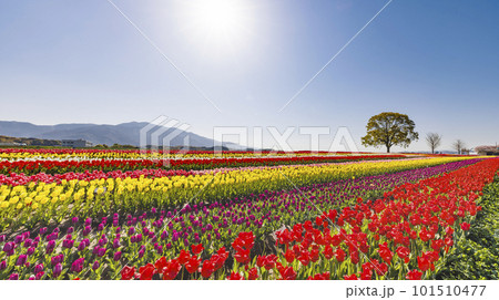 福岡県直方市の遠賀川河川敷のカラフルなチューリップ畑