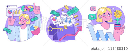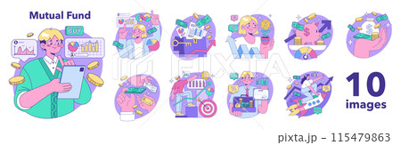 Mutual fund set. Investment fund, asset portfolio invested in stocks. Young character investing money with the prospect of profit. Modern investment vehicle. Flat vector illustration