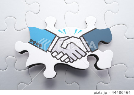 合意形成や戦略的パートナーシップのイメージ。握手するイラストが描かれたジグソーパズル。