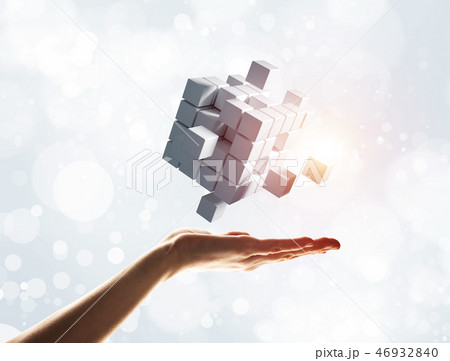 Cube white figure in male palm as symbol for integration. 3D rendering