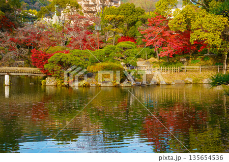 秋の神戸市・相楽園の日本庭園の池と紅葉
