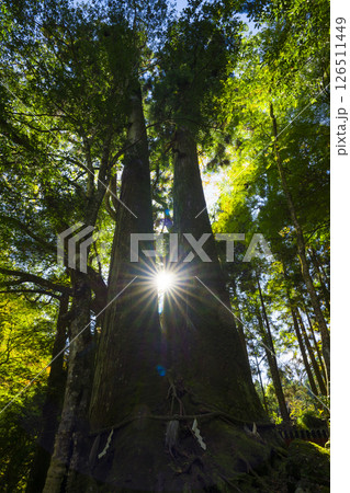 京都 貴船神社の相生杉(あいおいすぎ)の間からさす光