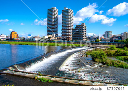 杜の都 仙台 広瀬川 秋 仲の瀬橋の上流のビル群