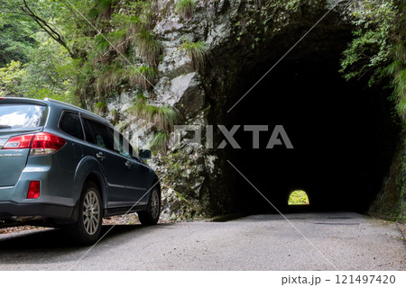 【国道193号】渓谷沿いの素掘りのトンネルと車
