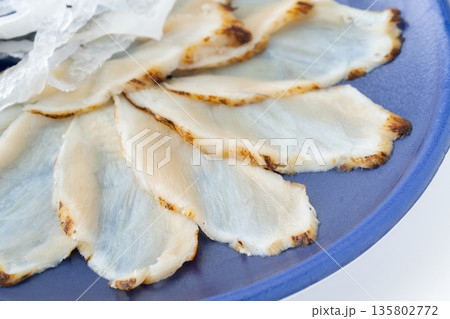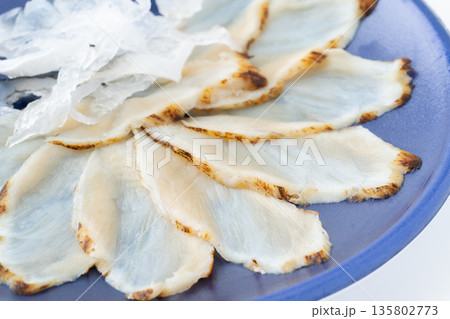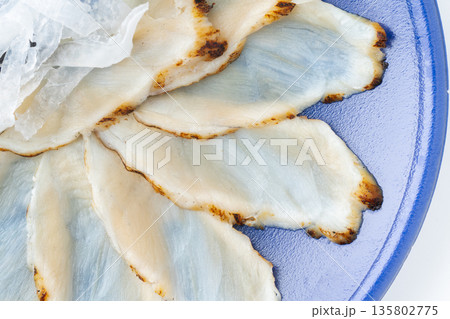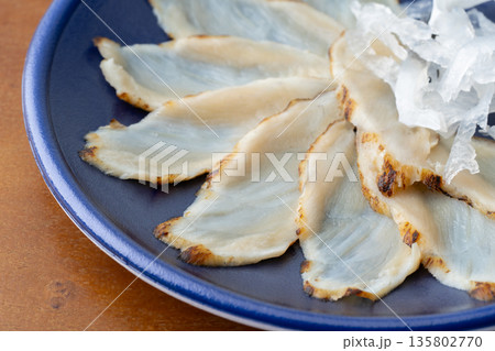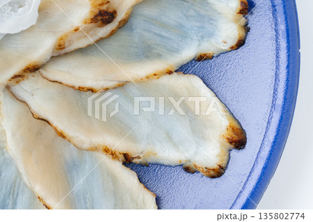 真ふぐの刺身(てっさ)の炙りのクローズアップ