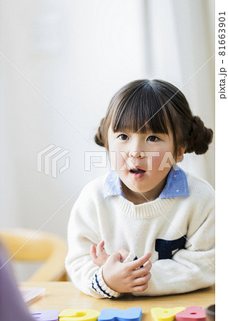 白背景の前で怒った顔の表現をする幼い女の子。幼児、教育、成長、表現、育児、子育てイメージ