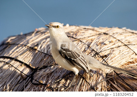 Tropical mockingbird is sitting on the roof of the beach umbrella in bright sunlight, blue sky on the background.