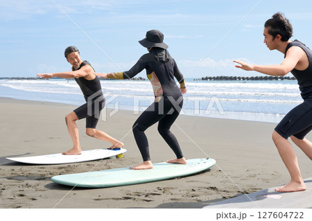 ビーチでサーフィン体験を受ける若者と指導者 サーフィンスクール イメージ