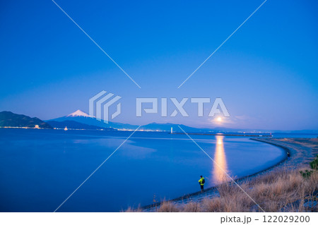 (静岡県)三保の海岸から望む富士山と昇る満月