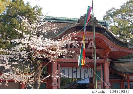 石清水八幡宮│朱塗りの社殿に映える桜と五色吹流│春の男山