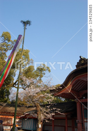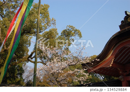 京都 桜風景│石清水八幡宮の社殿と春の青空│日本の伝統行事
