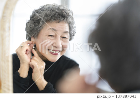 鏡を見ながらイヤリングをつける笑顔のシニア女性