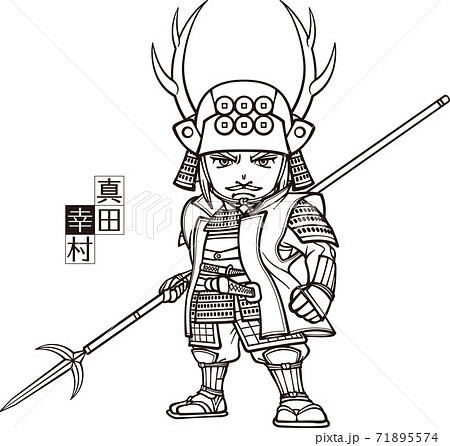 武装して槍を持って正面を向く真田幸村【3頭身・白黒】
