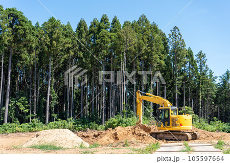 山間地で土砂を掘削する油圧ショベルイメージ|宅地開発イメージ|自然破壊イメージ|工事イメージ