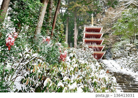 室生寺五重塔とシャクナゲ