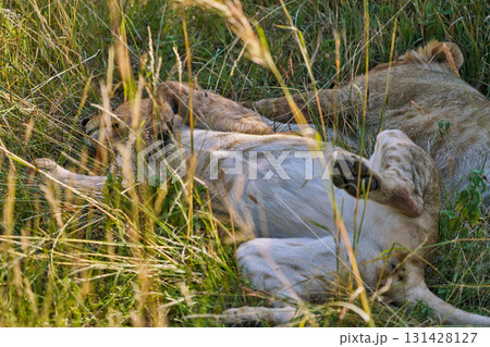 草むらの中で無防備に眠るライオン(マサイマラ)