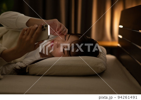 ベッドの中でスマホを見てにやける女性 ネガティブイメージ
