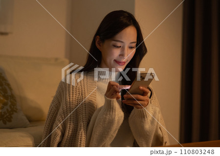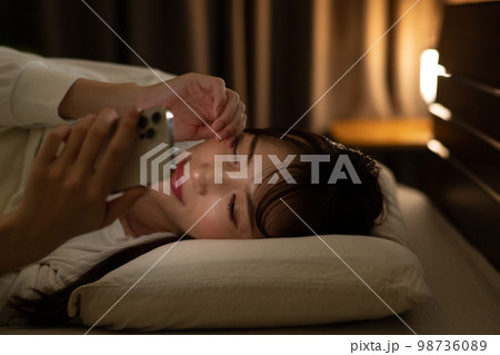 就寝前にスマホを見る日本人男性 ブルーライト 薄暗い