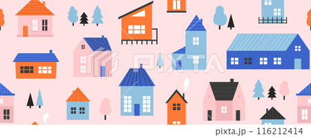Small cute house seamless pattern. Cartoon village town repeated texture. Doodle cosy tiny little cottages background. Repeating suburban town houses and trees wallpaper. Vector illustration