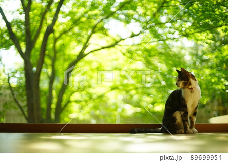 着物姿の日本人女性 縁側から庭園を眺める 青紅葉