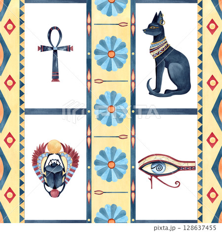 Egyptian seamless pattern with Bastet, Scarab beetle, eye of Horus, Ankh. Ancient vertical ornament with geometric patterns, sacred lotus. Watercolor isolated illustration. Religion icon for souvenir
