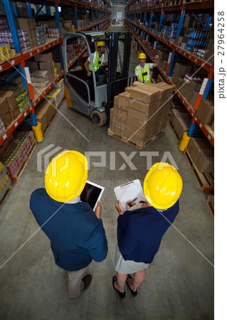 High angle view of manager wearing hard hat and looking workers