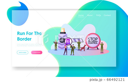 Border Guards Protect Territory Landing Page Template.Tiny Male Characters in Military Uniform with Gun Keep Watch on Stop Control Post with Huge Barrier and Dog. Cartoon People Vector Illustration