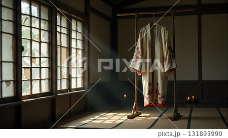 Kimono in Traditional Japanese Room, Minimalist Interior Design, Serene Scene with Dramatic Light Beam and Tatami Mats.