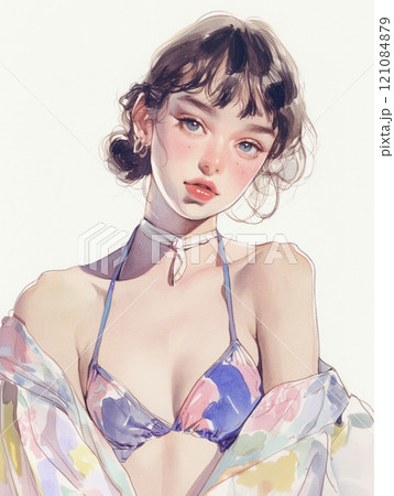 可愛いブラを試着するセクシーなショートヘアーの女の子モデルのカラー漫画イラスト