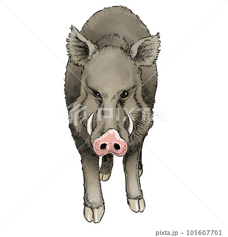 こちらを睨む野生のイノシシ真正面イラスト(こげ茶)