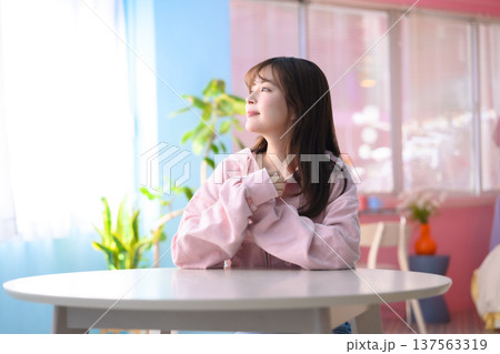 明るい部屋で窓の外を見つめる女性 :はっぴぃぽっぷ