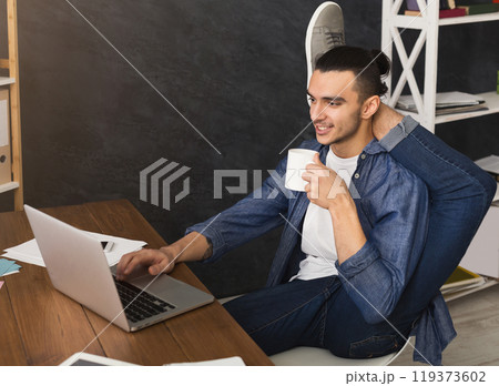 Short break for yoga in office. Flexible man practicing yoga at workplace, while typing on laptop and having coffee, copy space. Active employee at work, healthy lifestyle concept
