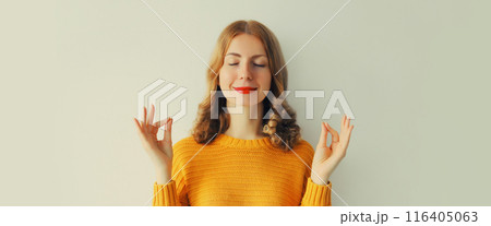 Calm relaxed healthy young woman meditates, girl practicing doing yoga exercises, stress relief