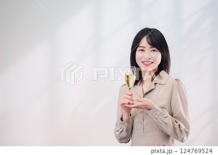 笑顔でスパークリングワインを飲む若い女性(シンプル背景)