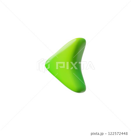 Green arrowhead 3D cartoon plastic vector icon, render glossy left pointer, click, play back button, previous cursor