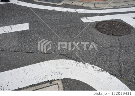 交差点の白線とマンホール|アスファルトの質感と道路構造