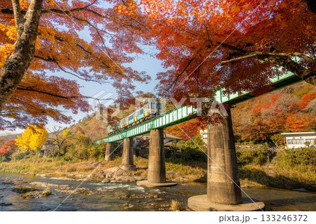 秋真っ盛り、太陽の光を通して真っ赤に輝くもみじと、鉄橋を渡るかわいいローカル線 矢祭山