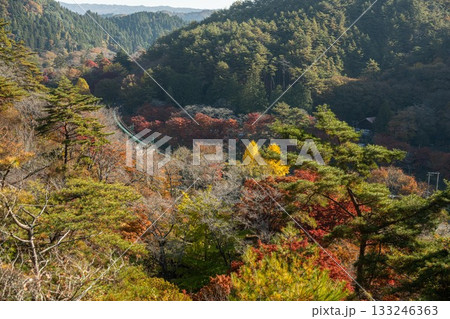 「もみじ林の中から見上げた水郡線」矢祭山背景に