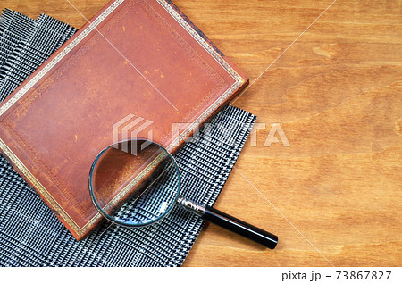 俯瞰から虫眼鏡と手帳とチェック柄の探偵のシーン