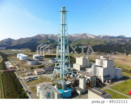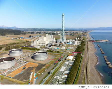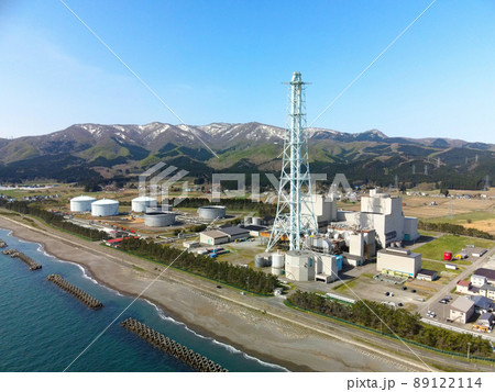 春の北海道知内町で北海道電力知内発電所の風景を空撮