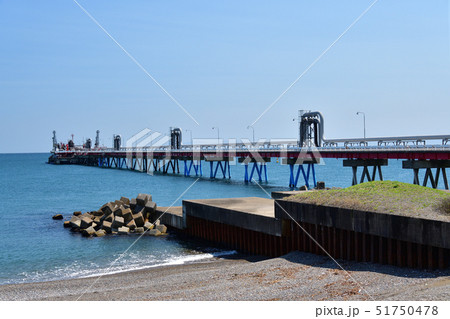 快晴の北海道知内町で北海道電力知内発電所の燃料パイプラインの風景を撮影