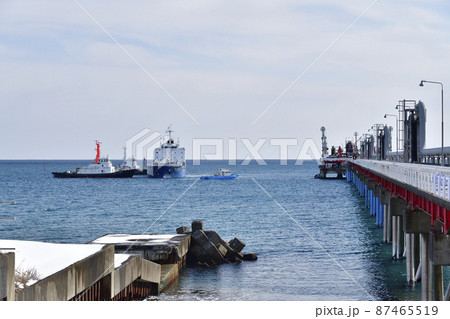 早春の北海道知内町で知内発電所荷揚げ桟橋に貨物船を接岸させる風景を撮影