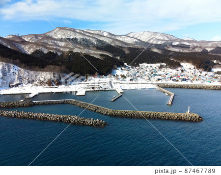 早春の北海道知内町涌元漁港の風景を空撮